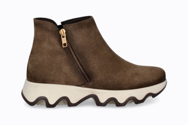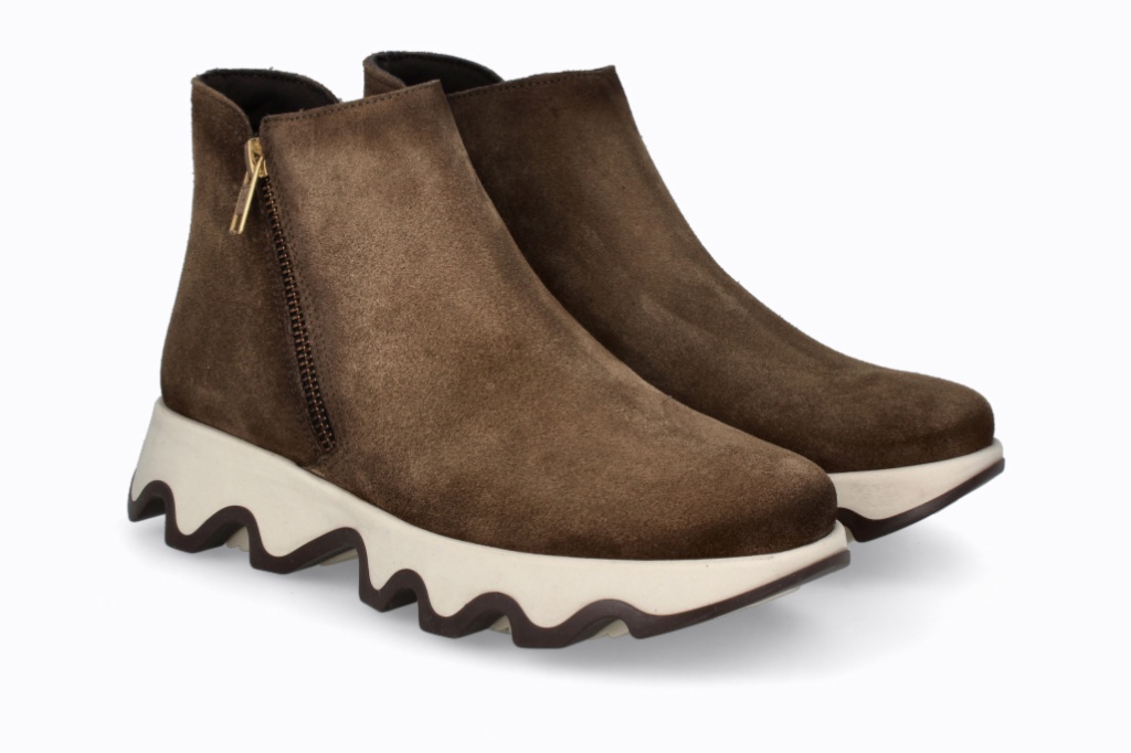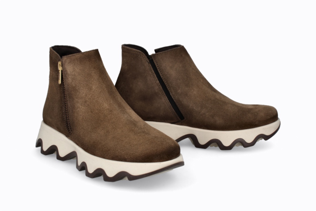 Botines de serraje en color kaki que combinan un diseño moderno con comodidad excepcional. Su suela ondulada añade estilo y estabilidad, mientras que el ajuste alto brinda soporte y una apariencia elegante. Perfectas para quienes buscan funcionalidad y moda en un solo calzado.